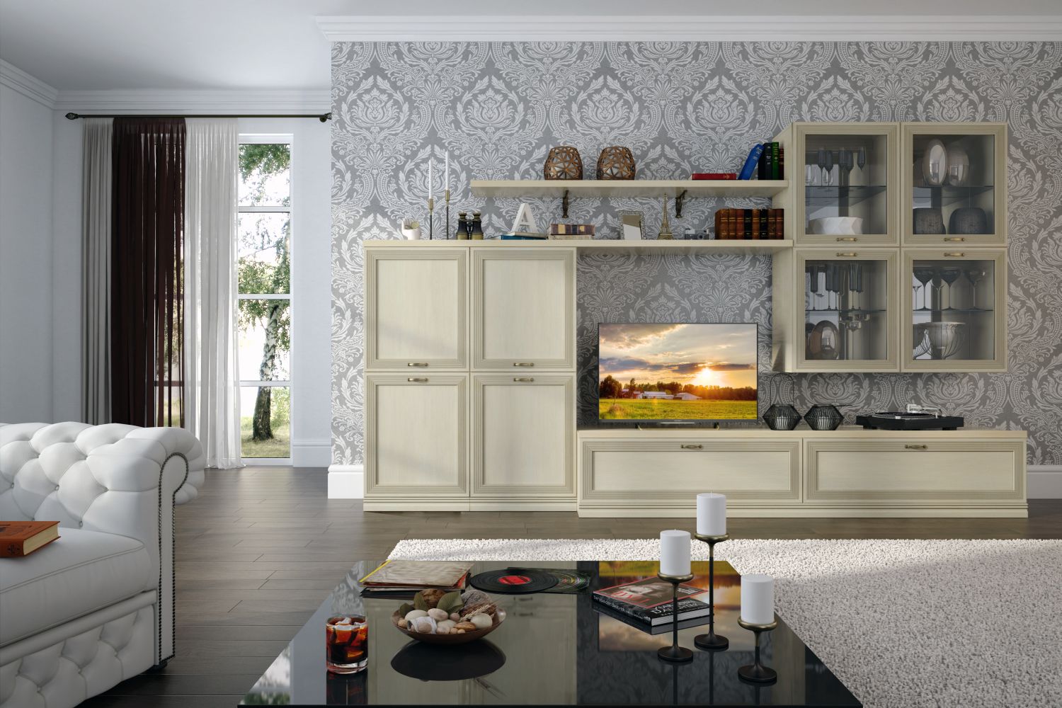 Для создания еще более гармоничного интерьера в гостиную можно дополнительно подобрать кремовый или темный диван классических форм, изящный журнальный столик со стеклянной поверхностью. Если же вы хотите совместить гостиную с рабочей зоной — не забудьте про стол на высоких ножках и мягкое кресло с текстурной обивкой.