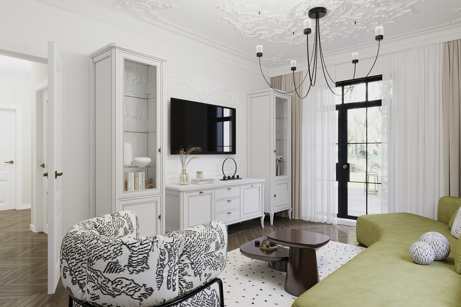 – описание: назначение для гостиной, размер 214.8x287x50.5 см, цвет бело-серый, стиль неоклассика.